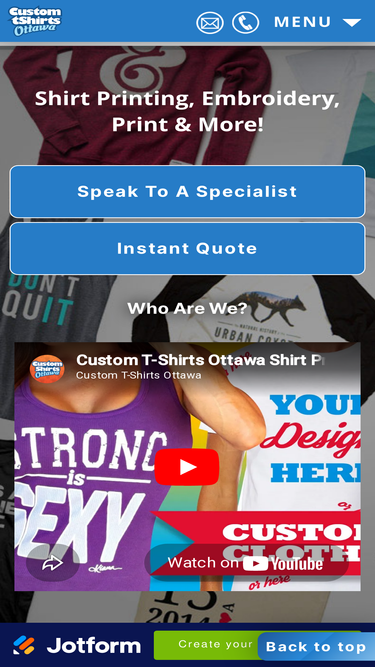 100%Custom T-Shirts Ottawa provides t-shirt printing services and more. Custom shirts, tanks, hoodies, hats. No minimums. We also provide business card printing and embroidery.