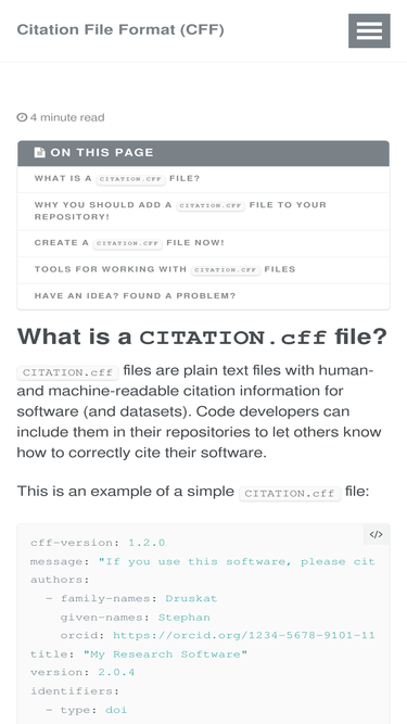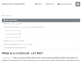 82%landing page for the citation file format (cff), a yaml 1.2-based format for providing citation metadata for (research/scientific) software.