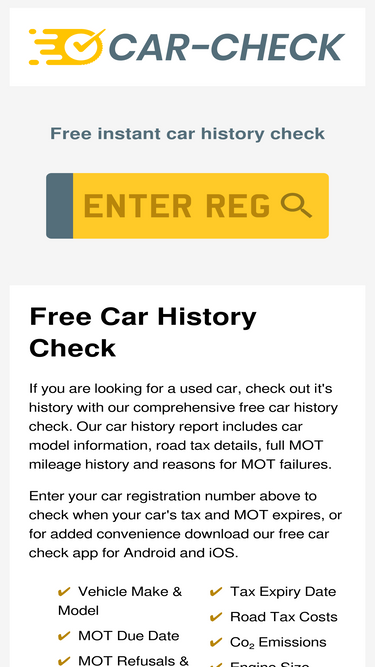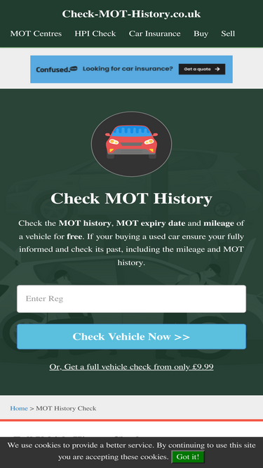 84%Check your vehicles MOT history for free, if your buying a used car check it's past including MOT history, MOT due dates and vehicle mileage.