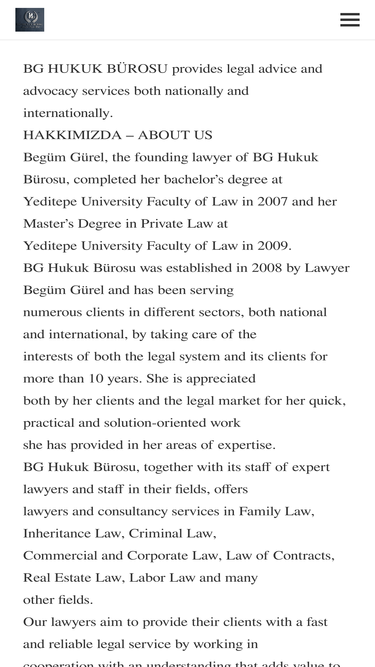 79%BG HUKUK BÜROSU provides legal advice and advocacy services both nationally and internationally. HAKKIMIZDA – ABOUT US Begüm Gürel, the founding lawyer of BG Hukuk Bürosu, completed her bachelor’s degree at Yeditepe University Faculty of Law in 2007 and her Master’s Degree in Private Law at Yeditepe University Faculty of Law in 2009. BG Hukuk...