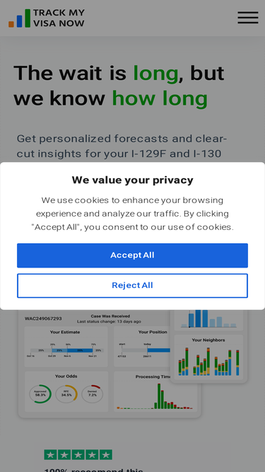 90%track my visa now tracks the uscis processing time for visa applications. you can check your estimated wait time for form i-129f and form i-130.