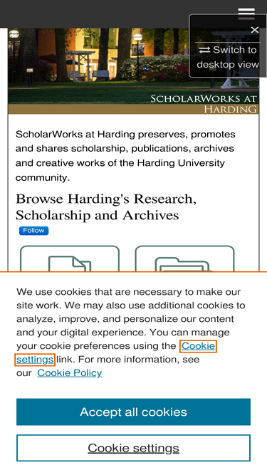 76%the institutional repository at harding university houses articles, dissertations, theses, and presentations by faculty and students. it is also the publishing platform for the journal of graduate education research and tenor of our times. it is also home to the university's digital archives.