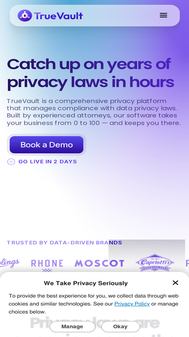 96%TrueVault is a comprehensive privacy platform that manages compliance with data privacy laws. Built by experienced attorneys, our software takes your business from 0 to 100 — and keeps you there.