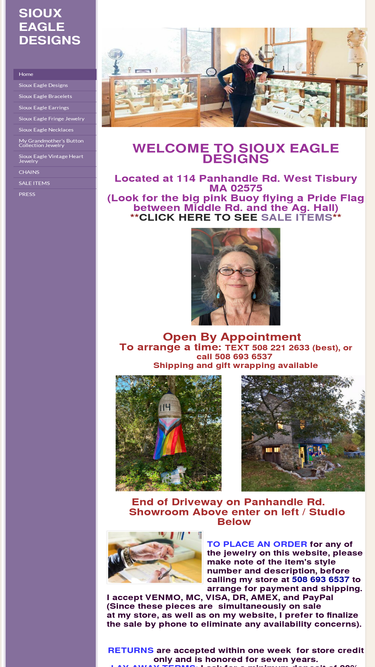 100%WELCOME TO SIOUX EAGLE DESIGNS Located at 114 Panhandle Rd. West Tisbury MA 02575 ( Look for the big pink Buoy flying a Pride Flag between Middle Rd. and the Ag. Hall) ** CLICK HERE TO SEE SALE...