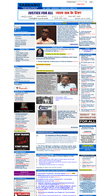 66%sabrang communications publishes a monthly magazine -- communalism combat --, runs a project on secular education and teaching tolerance for schools - khoj --, promotes penpals among school going children in india, pakistan, bangladesh and sri lanka - aman -, does a daily media monitor of human rights violations in india - india, rights and wrongs, and is actively concerned with issues concerning dalit rights and women's rights.