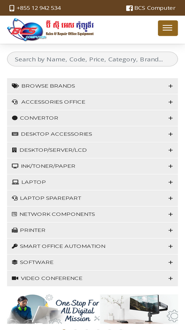 100%BCS Computer has been established since 2006. BCS Computer from word Best Collection Service Acer, Toshiba, Dell, HP, Samsung, Lenovo, NEC, SONY, Apple, Panasonic, TP Link and Others. MISSION BCS Computer has subjects to Develop technology in Cambodia -Supply the modern technical equipments to Government, Enterprises, NGOs, and clients-Improve students with special price... SERVICES Selling and Repairing: Printer, Photocopy ,Computer,Camera security , Fax, PABX Telephone System LCD Projector, Copier.... Printer Ink and toner Refill: HP, Canon, Brother, Minolta, Xerox, Samnung, Toshiba.... Office Machine for Rental: LCD, Computer, Printer, Fax, Scanner, Photo Copy. Office Machine for Maintenance Service. Installing, cablling configuration Network server, Telephone System, camera Security, Finger Print and software data controll managerment Tel : 023 996 860, 023 882 403, 012 466 958, 012 942 534, , 093 229 889 E-mail : amveasna82@gmail.com, sales@bcscomputer.net Website: www.bcscomputer.net Address: #370Eo, St. 128 ( Kampuchea Krom), S/K Mittapheap, Khan 7Makara, Phnom Penh, Cambodia