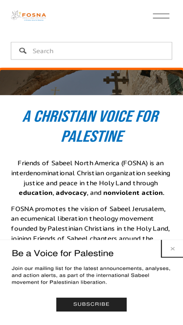 100%A Christian Voice for Palestine: Friends of Sabeel North America (FOSNA) is a trans-denominational Christian organization seeking justice and peace in the Holy Land through education, advocacy, and nonviolent action.