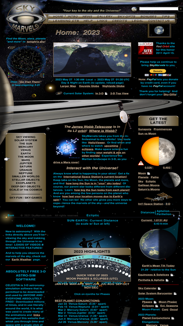 100%skymarvels home. skymarvels: your key to the sky and the universe! astronomy interactives. your gateway to astronomy interactives, animations and videos galore! streak through the universe in stunning 3-d! trek to planets, moons, stars, galaxies! real astronomy for all ages! startlingly realistic! skymarvels uses the incredible, free astronomy-simulation software celestia to whisk you through space and time effortlessly! awesome animations, scripts, add-ons, tools and more bring you astronomical experiences with no equal! like earth's current day-night map, s solar events, sun's current position over earth, current sunsize vs moonsize, sun and moon current apparent sizes, current geocentric apparent sizes of the sun and moon. today's sunrise and sunset, eclipses, eclipse calendar,earth's 12-month heartbeat! tonight's sky maps! solar system barycenter. and our exclusive downloadable astronomy posters (like our time zones poster and earth's tides poster) will make your voyages all the more rewarding. lots of free stuff! usgs daily earthquake map, apollo 11