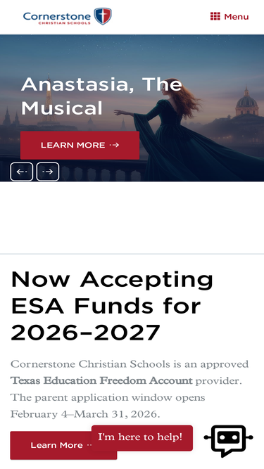 41%Cornerstone Christian Schools boasts a beautiful, multi-building campus nestled in northern San Antonio. Each main school building features its own classrooms, library, cafeteria, gymnasiums, locker rooms, restrooms, faculty work centers, and administrative offices. Our ongoing mission compels us to develop students to their maximum potential, and we promise to serve your family with excellence. Keep reading to learn more about how we will nurture and challenge your student -- spiritually, mentally, physically, and socially -- to fulfill his or her divine destiny.