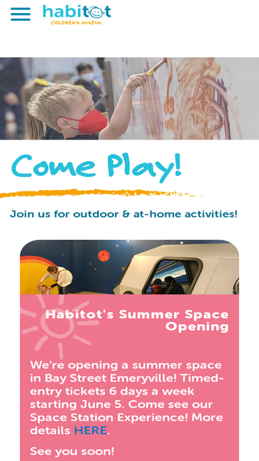 89%Mobile Museum Reaches the East Bay! During the pandemic, and after the sale of our long-term museum space to developers in 2021, Habitot launched a Mobile Museum to continue serving our audience of families with young children with enriching play and learning experiences and much-needed social interaction. Events have been presented in more than 40