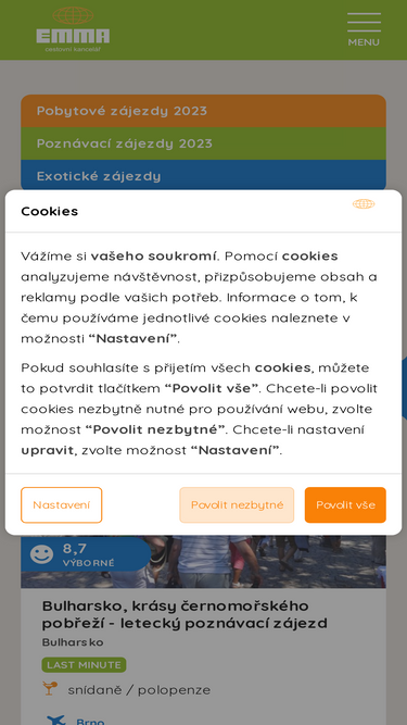 98%Cestovní kancelář EMMA pro Vás nabízí pobytové zájezdy do Španělska, Bulharska, Chorvatska, Mallorca s odlety z Brna, Ostravy a Prahy, poznávací a exotické zájezdy