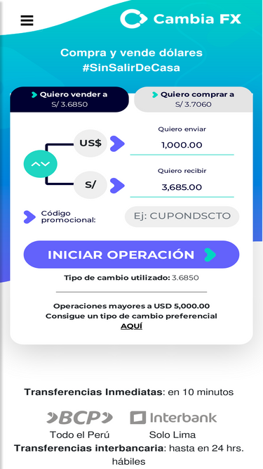 85%Consigue el mejor tipo de cambio para cambiar dólares y soles online en Perú. Con CAMBIA FX hazlo Simple, Rápido y Seguro Recuerda NO aceptamos abonos en efectivo en nuestras cuentas bancarias.