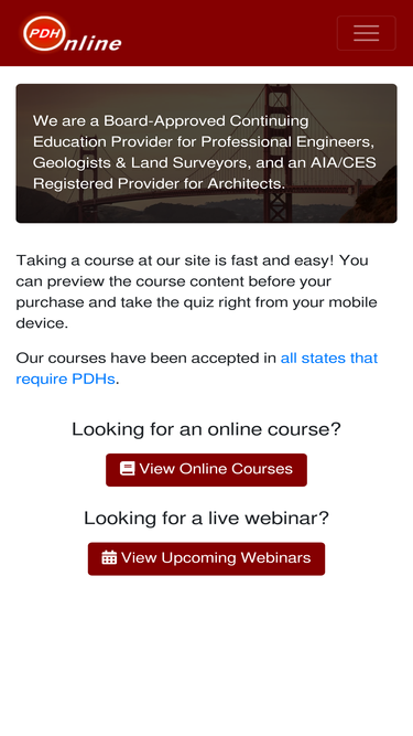 100%pdhonline.org offers engineering continuing education pe pls ls aia ra web-based pdh professional development courses for license renewal - civil structural mechanical electrical chemical engineering course hours units credits pdhs continuing education ceu ceus aia learning units lu lus for engineer engineers p.e. land surveyor surveyors and architect architects geologist geologists a.i.a. provider sponsor free engineering forum software technical publication resource cep cpc cpd