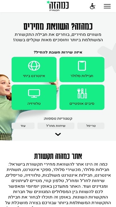 72%כמהזה – השוואת מחירים: ספק ותשתית אינטרנט, חבילות סלולר, טלוויזיה, שיחות לחו"ל וטלפון קווי. מצאו את חבילות התקשורת המשתלמות ביותר עבורכם.
