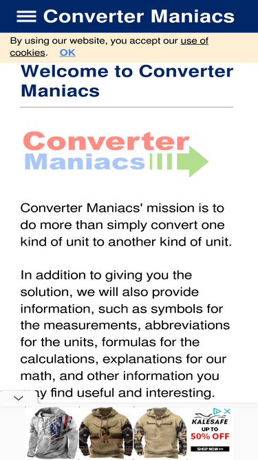 89%welcome to converter maniacs. our mission is to do more than simply convert one kind of unit to another kind of unit: we will explain and show our calculations.