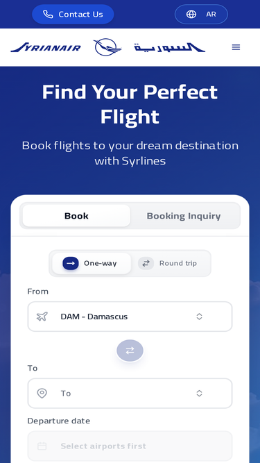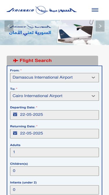 95%احجز رحلاتك مع السورية للطيران - شركة الطيران الوطنية السورية للسفر المريح والآمن | Book flights with Syrian Airlines - Syria's national carrier for safe and comfortable travel.