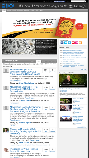 82%the management innovation exchange (mix) is an open innovation project aimed at reinventing management for the 21st century. the premise: while "modern" management is one of humankind's most important inventions, it is now a mature technology that must be reinvented for a new age. it's time to hack management.