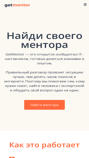 100%getmentor – это открытое комьюнити it-наставников, готовых делиться своими опытом и знаниями. наша задача – помогать людям находить ответы на свои вопросы в работе или жизни через прямой доступ к экспертизе в разговоре 1-на-1.