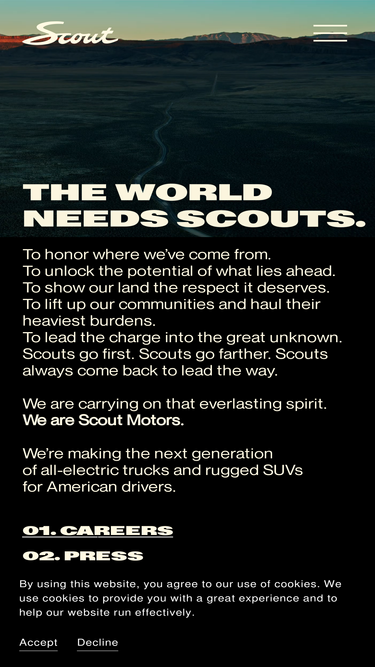 85%Designed in Motor City, built in Blythewood, and showing up everywhere soon, Scout Motors is America’s next good thing. We’re building the next great car company right here; retooled, reinvigorated, and reimagined for the modern era.