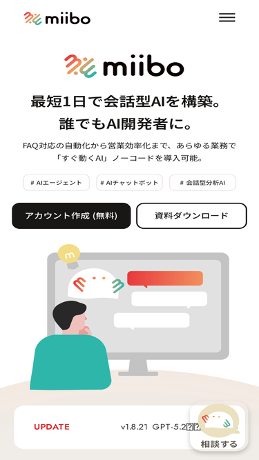 76%miibo(ミーボ)は、会話型AIをノーコードで簡単に構築から運用まで行えるプラットフォームです。最新のLLM(大規模言語モデル)を活用し、AIと会話できるアプリケーションを手軽にカスタマイズできます。既存データベースやお使いのコミュニケーションツールと連携することで、実用性の高い対話型AIを開発できます。