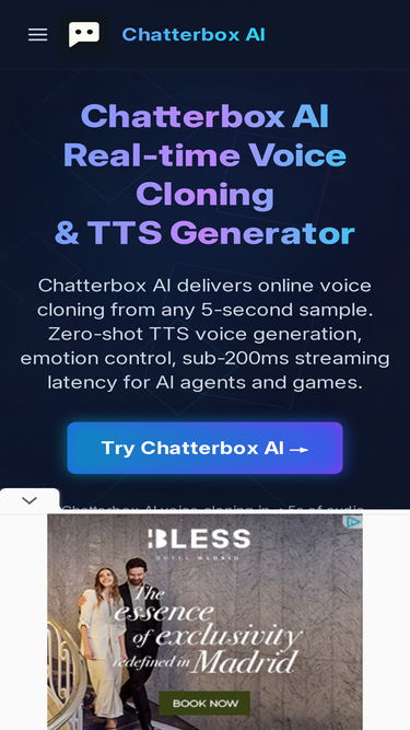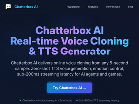 Chatterbox AI: Online text-to-speech (TTS) and 5-second voice cloning generator built on the open-source Chatterbox AI model. Sub-200ms latency, emotion control, easy-to-use online voice generator.