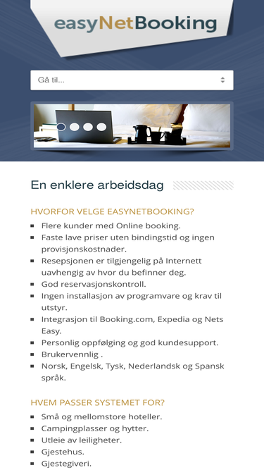 91%easynetbooking er et brukervennlig og nettbasert bookingsystem som passer godt for alle typer overnattingssteder. systemet inkluderer online booking og online resepsjon.