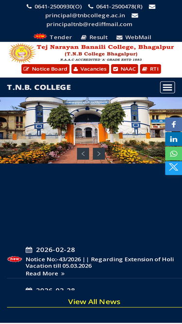 91%t.n.b. college, founded in 1883, is a constituent unit of t.m. bhagalpur university. it occupies the foremost position among the peer colleges of the university and is acclaimed as an institution for imparting quality education in the faculties of science, arts and vocational courses.