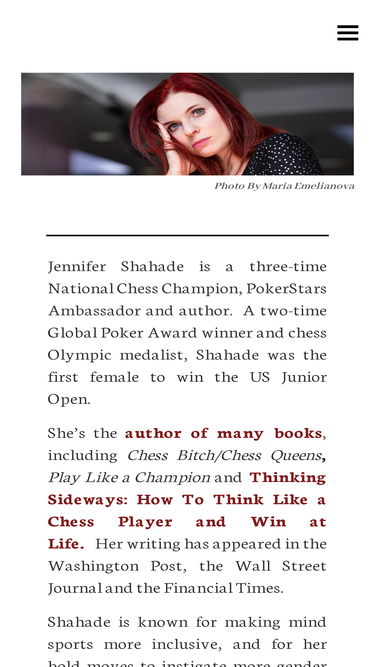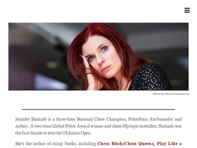 100%Photo By Maria Emelianova Jennifer Shahade is a three-time National Chess Champion, PokerStars Ambassador and author. A two-time Global Poker Award winner and chess Olympic medallist, Shahade was the first female to win the US Junior Open. She’s the author of many books, including Chess Bitch/Chess Queens, Play Like a Champion and the forthcoming Thinking...