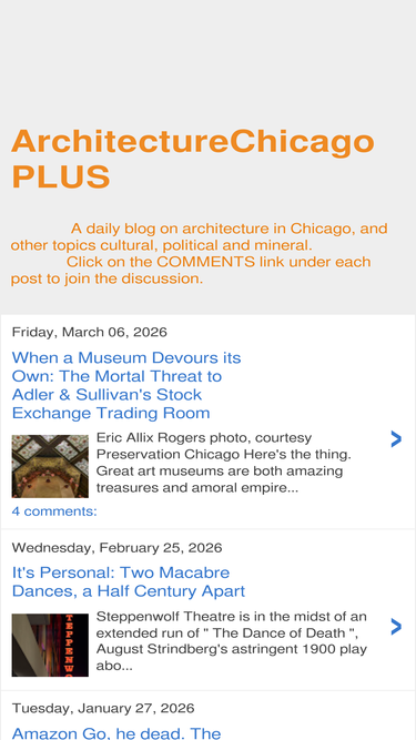 A daily blog on architecture in Chicago, and other topics cultural, political and mineral. Click on the COMMENTS link under each post to join the discussion.