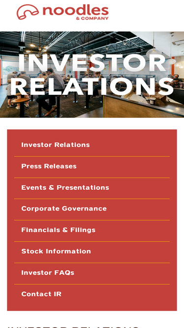 82%The Investor Relations website contains information about Noodles & Company 's business for stockholders, potential investors, and financial analysts.