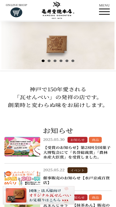 76%神戸で愛され続ける瓦せんべい。亀井堂総本店の150年の伝統が詰まった神戸銘菓をぜひお試しください。全国配送対応も承ります。