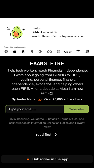 81%I help tech workers reach Financial Independence. I write about going from FAANG to FIRE, investing, personal finance, financial independence, avocados, and helping others reach FIRE. After a decade at Meta I am now semi-🔥. Click to read FAANG FIRE, by Andre Nader, a Substack publication with tens of thousands of subscribers.