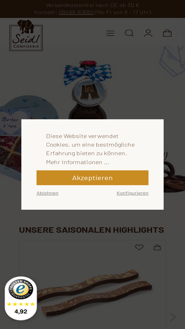 92%Seit über 25 Jahren produziert die Seidl Confiserie erstklassige Schokoladen, Nüsse, Pralinen und viele andere Süßigkeiten. Jetzt online bestellen & probieren!