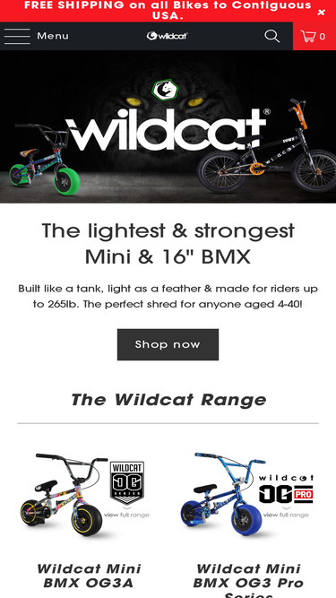 Get the best BMX Mini bike in the USA + Canada. Wildcat Mini BMX Bikes now available. The only mini rocker or fatboy mini with disc brakes. Huge range of colors. Free Shipping. Mini BMX reviews.