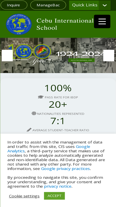 We are an IB World School offering PYP, MYP (candidate status), & DP and accredited by the CIS (Council of International Schools), WASC (Western Association of Schools & Colleges), and PAASCU in the Philippines.