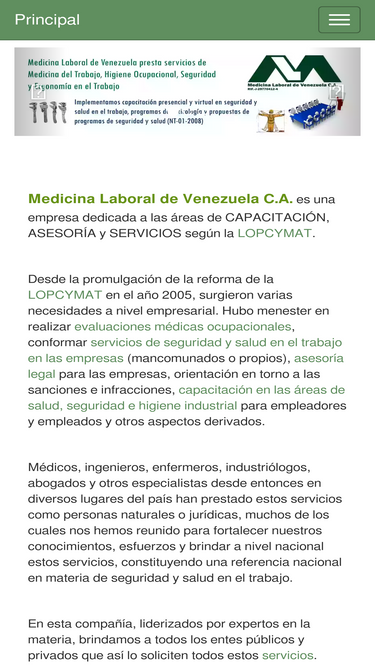 58%medicina laboral de venezuela c.a. es una empresa dedicada a las areas de capacitacion, asesoria y servicios segun la lopcymat. su mision es prestar servicios, asesoria y capacitacion en seguridad y salud en el trabajo. su vision es conformar una institucion de referencia nacional en el ambito de los servicios de seguridad y salud en el trabajo, cumpliendo con la filosofia de la implementacion de un sistema de calidad en todos sus procesos y servicios prestados, garantizando asi la satisfaccion del cliente, la estabilidad y seguridad de sus empleados, la rentabilidad de sus accionistas, el cuidado del medio ambiente y la responsabilidad social. presta servicios de medicina del trabajo (preempleo, prevacaciones, posvacaciones, posempleo), estudios especiales (audiometrias, espirometrias, radiografias, electrocardiograma), vigilancia epidemiologica, evaluaciones de puestos de trabajo (estudios de ruido, polvo, iluminacion, estres termico, ergonomia, riesgos psicosociales), elaboramos el programa de seguridad y salud, conformacion del comite de seguridad y salud, asesoria en seguridad y salud, asesoría en de lopcymat y conapdis, capacitacion para cumplir con las 16 horas trimestrales, servicio de seguridad y salud, sistema de vigilancia de la utilizacion del tiempo libre, programa de recracion y utilizacion del tiempo libre, evaluaciones medicas premaritimas (medicina maritima), gerenciamos proyectos especiales de seguridad y salud y otros segun los requerimientos del cliente