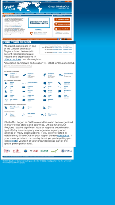 68%Great ShakeOut Earthquake Drills help people in homes, schools, and organizations worldwide improve preparedness and practice how to be safe during earthquakes. Register to participate in your state or country's drill at www.ShakeOut.org.