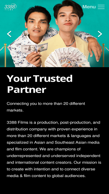 82%3388 films is a production, post-production and distribution company with proven experience in more than 20 different markets & languages, and specialized in asian and southeast asian media and film content. we are a champion of underrepresented and underserved independent and international content creators. our mission is to create with intention and to connect diverse media & film content to global audiences. connecting you to more than 20 different markets.