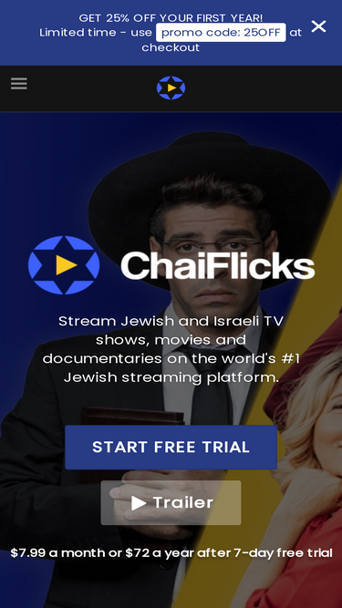 92%ChaiFlicks is a streaming service bringing you the best Jewish and Israeli TV, movies, and documentaries. Activate your 7-Day free trial and start streaming right away. Watch anywhere or cancel anytime at no cost. Note: To redeem a coupon code, make sure to select the right subscription term! We use Stripe to protect your credit card information. We are always here to help! Contact a member of our team at anism@chaiflicks.com.