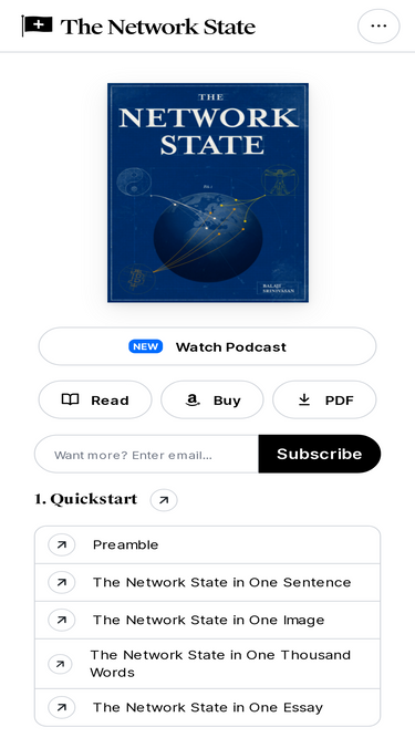 A network state is a highly aligned online community with a capacity for collective action that crowdfunds territory around the world and eventually gains diplomatic recognition from pre-existing states.