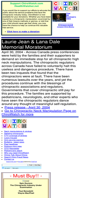 chirowatch.com - we educate the public about the risks of certain chiropractic treatments. when infants and children, without informed consent are treated for otitis media, asthma, bedwetting, and hyperactivity by untrained pseudoscientific practitioners, the public has a right to know. this canadian based site was dedicated to the victims of chiropractors everywhere. we especially extend our best wishes to the family of laura mathiason, a 20 year old woman from regina, sk, who died after her neck was manipulated by her chiropractor. pediatricians spend 4 years in medical school, and 4 years or more in residency programs to practice pediatrics. chiropractors take weekend courses at hotels and expect to be primary care providers. we want to know why the government hasn't stopped them.