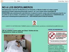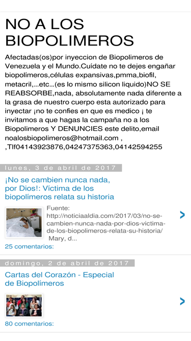 Afectadas(os)por inyeccion de Biopolimeros de Venezuela y el Mundo.Cuídate no te dejes engañar biopolímeros,células expansivas,pmma,biofil, metacril,…etc…(es lo mismo silicon liquido)NO SE REABSORBE,nada, absolutamente nada diferente a la grasa de nuestro cuerpo esta autorizado para inyectar ¡no te confies en que es medico ¡ te invitamos a que hagas la campaña no a los Biopolimeros Y DENUNCIES este delito,email noalosbiopolimeros@hotmail.com , ,Tlf04143923876,04247375363,04142594255