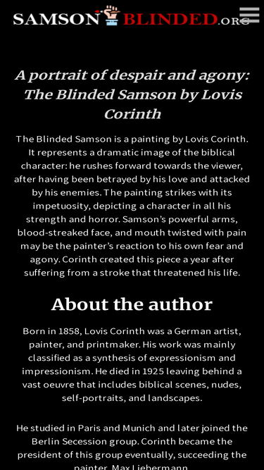 77%unlike rembrandt, corinth depicts only the hero’s suffering, reveling in this story all its tragedy and drama. this may be an autobiographical piece.