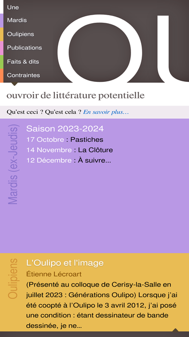 85%site officiel de l'ouvroir de littérature potentielle: présentation, espace des oulipiens, textes en ligne, calendrier des jeudis, bibliothèque oulipienne, contraintes...