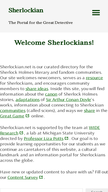 84%Sherlockian.net is your curated directory for Sherlock Holmes! Our site welcomes newcomers, serves as a resource for Sherlockians, works to collect important resources for our community, and encourages participants to share in the Great Game. This site is maintained by WIDE Research, a lab at Michigan State University directed by Liza Potts. We are caretakers of this […]