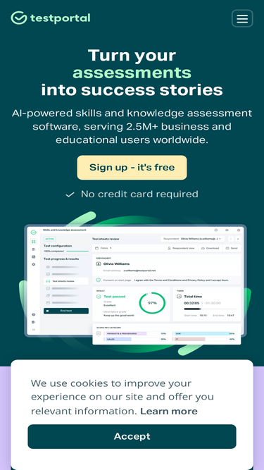 85%build automatically graded tests. distribute online, or print. analyze and export results. great tool for teachers, trainers and employers.