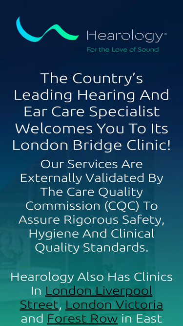 100%Welcome to Hearology London Bridge 8am-8pm weekday appointments and Saturday opening for Ear Cleaning, Hearing Tests and Balance Restoration. Includes children – click below We also have Ear Care and Balance Clinics in London Victoria, Liverpool Street and Euston