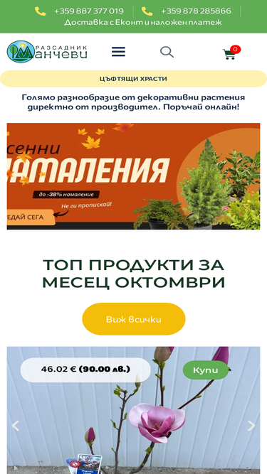 97%Открийте разнообразие от растения за вашата градина, дом или офис. Предлагаме всички видове растения – от декоративни цветя до устойчиви храсти. Разкрасете пространството си с нашите свежи предложения.