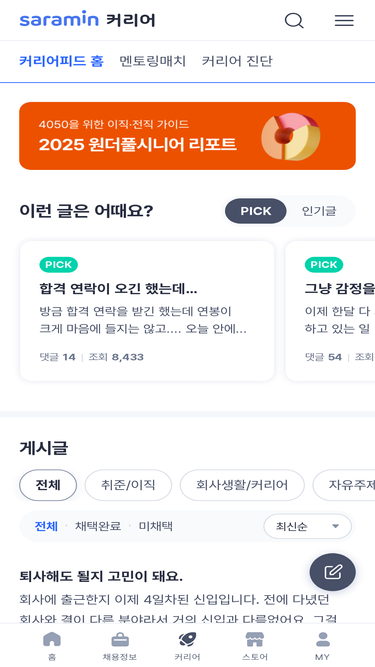 87%커리어 고민 상담이 필요할 때, 커리어피드에 질문하세요. 550만 현직자가 연봉, 이직, 퇴사, 면접, 자소서 등 다양한 커리어 고민에 답변해 드려요!