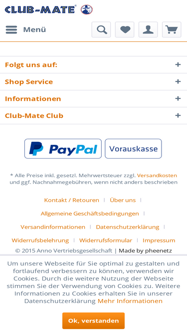 100%Mit dem natürlichen Koffein aus Mate, Colanuss, Tee und Kaffee. Ohne Zusatz von künstlichem Koffein. Erhöhter Koffeingehalt. Für Kinder und schwangere oder stillende Frauen nicht empfohlen (15 mg je 100 ml) Zutaten: Wasser, Glukose-Fructosesirup, Zucker, Getränkegrundstoff (Mate-Extrakt, Colanuss-Extrakt, Tee-Extrakt, natürliches Aroma, Farbstoff: Zuckerkulör E 150d, Säuerungsmittel: Phosphorsäure), Kohlensäure Nährwertangaben je 100 ml: Brennwert: 167 kJ / 40 kcal Fett: 0 g davon gesättigte Fettsäuren: 0 g Kohlenhydrate: 10 g davon Zucker: 10 g Eiweiß: 0 g Salz: 0 g Hersteller/Land: Brauerei Loscher GmbH & Co. KG, Steigerwaldstr. 21-23, 91481 Münchsteinach, Deutschland